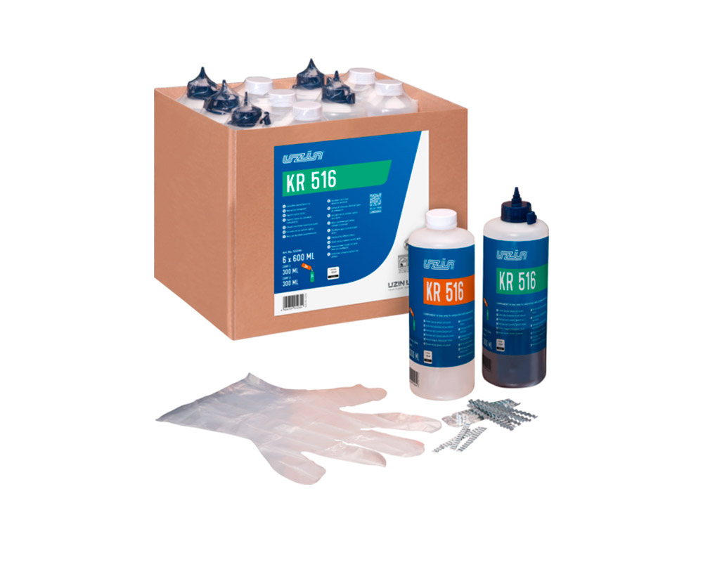 Uzin KR 516 (Уцин КР 516) - двухкомпонентная силикатная смола на бикарбонатно-полиуретановой основе без запаха, широкого применения, для силового замыкания трещин и швов стяжки, а также для заливки, заполнения, склейки и покрытия минеральных оснований. Для внутренних и наружных работ.