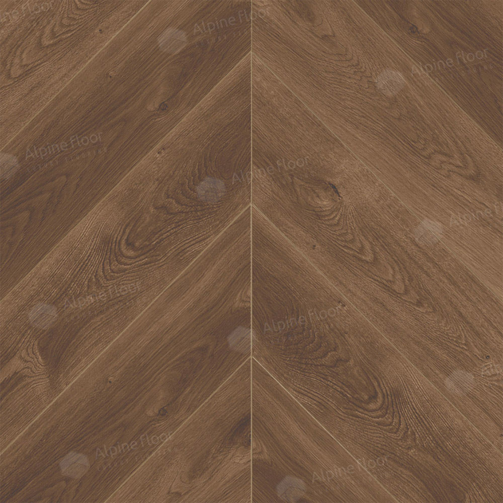 Кварц-винил SPC ECO 18-13 Дуб Коричневый от производителя Alpine Floor (Альпайн Флор), коллекция: Chevron. Имеет защитный слой: 0,55мм. Размер планки: 600х127х5мм, рисунок укладки: Французская елка. Замковое соединение, подходит для полов с подогревом до +28С.